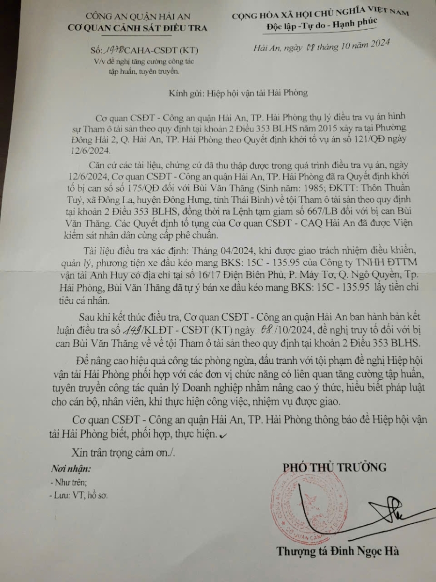 Kính gửi các Doanh nghiệp vận tải: Văn bản số 1978/CAHA-CSĐT (KT) ngày 08/10/2024 của Cơ quan Cảnh sát điều tra Công an quận Hải An gửi Hiệp hội vận tải Hải Phòng V/v đề nghị tăng cường công tác tập huấn tuyên truyền để nâng cao hiệu quả công tác phòng ngừa, đấu tranh với tội phạm, quản lý Doanh nghiệp nhằm nâng cao ý thức, hiểu biết pháp luật cho cán bộ, nhân viên khi thực hiện công việc, nhiệm vụ được giao. Văn phòng Hiệp hội vận tải HP gửi kèm theo văn bản với nội dung trên để doanh nghiệp nghiên cứu thực hiện./.